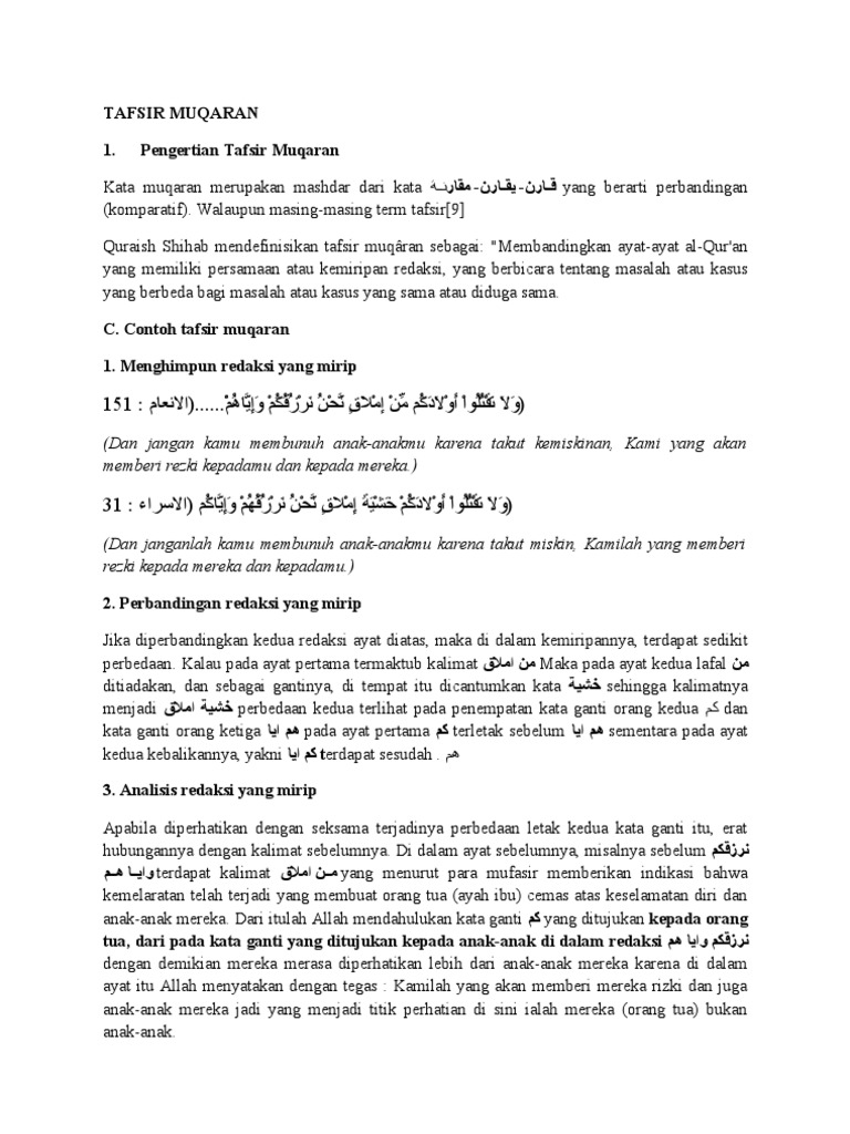 Secara terminologis adalah menafsirkan sekelompok ayat Al Quran atau suatu surat tertentu dengan cara membandingkan antara ayat dengan ayat atau atara ayat dengan hadits atau antara pendapat ulama tafsir dengan menonjolkan aspek-aspek perbedaan tertentu dari obyek yang dibandingkan. Pengertian Tafsir al-Quran Menurut bahasa kata tafsir berwazan dari kata dasar al fasr yang berarti menjelaskan atau menyingkap makna yang abstrak kata tafsir bisa juga diambil dari attafsir yaitu suatu ilmu yang digunakan dokter untuk mengetahui penyakit. Metode Muqarran Tafsir ini menggunakan metode perbandingan antara ayat dengan ayat atau.