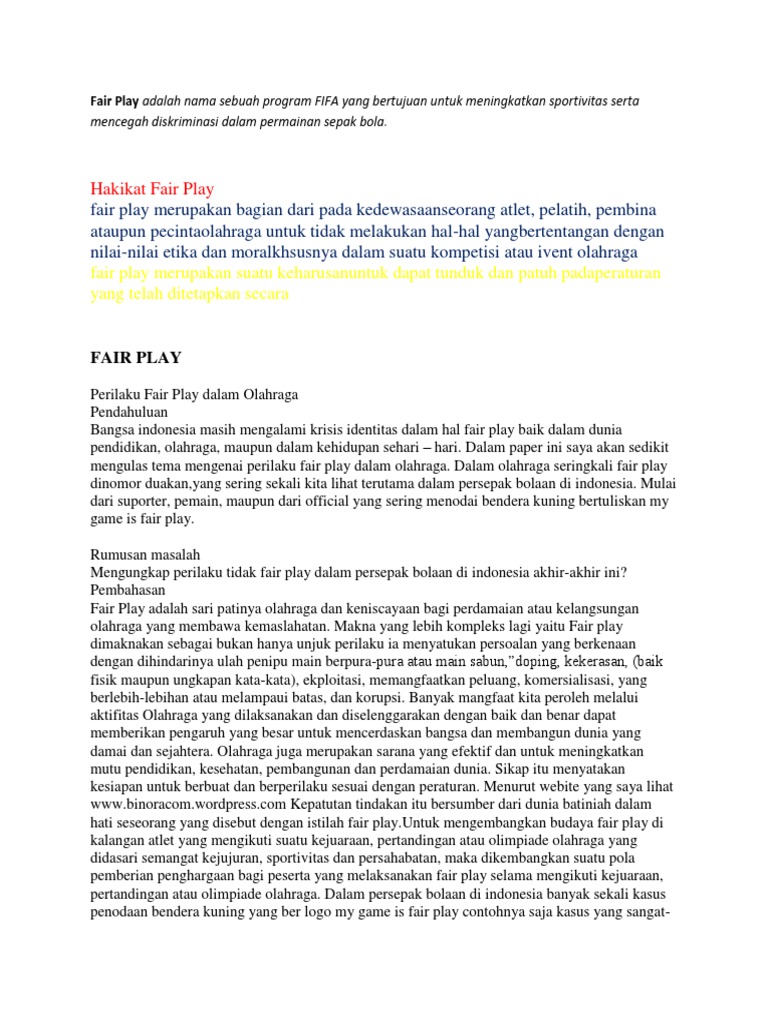 Fair play adalah suatu bentuk harga diri yang tercermin dari. Lembaga ini dibentuk atas dasar persetujuan secara tertulis Komite Olahraga Nasional Indonesia KONI dengan IOC yang termaktub tujuan untuk menciptakan rasa sportifitas dan fair play dalam olahraga. Melatih keterampilan dalam membuat makalah 5.